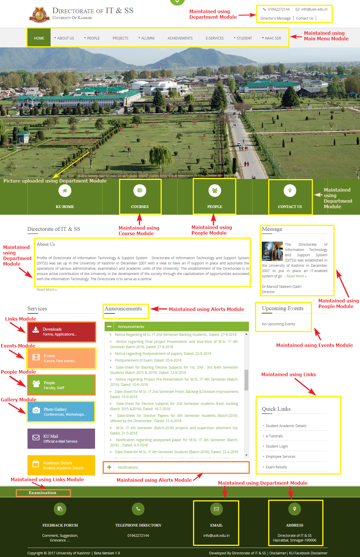 The application caters to websites of the Departments, Centers, Directorates, Dean etc. of the University of Kashmir.